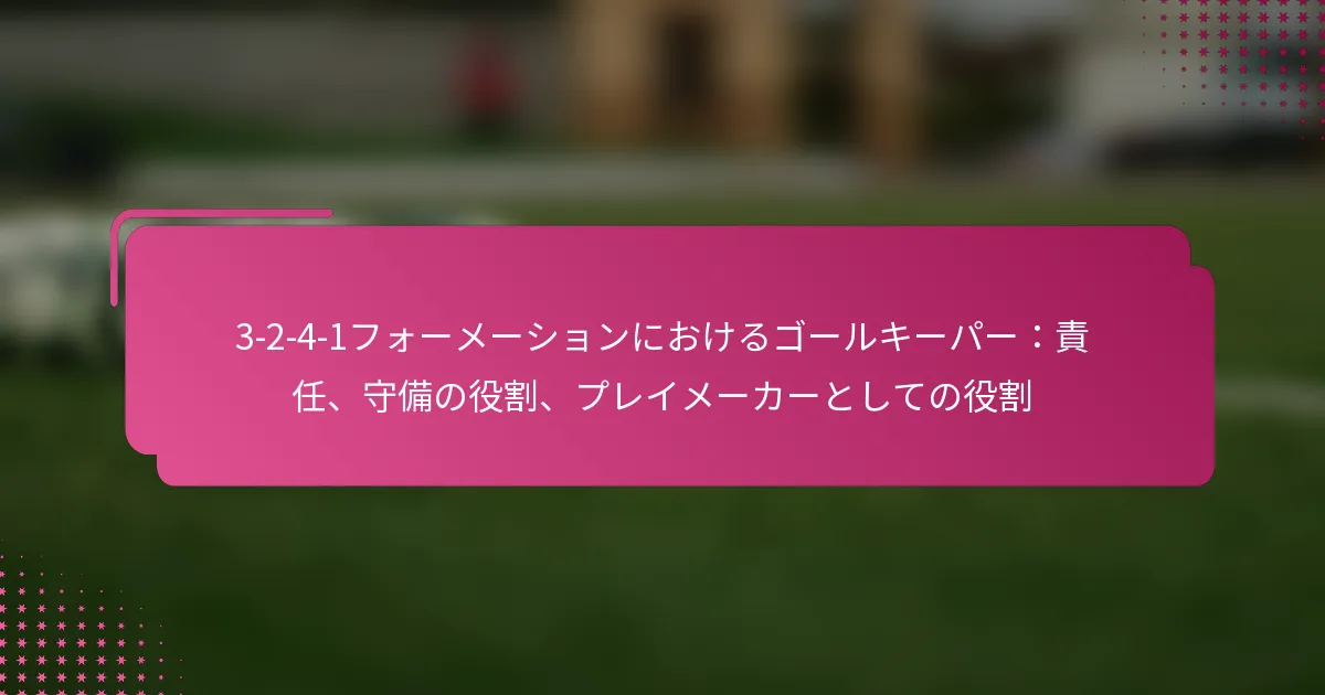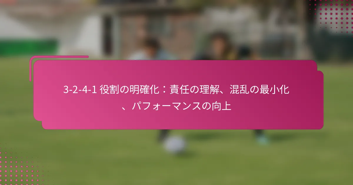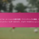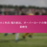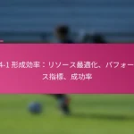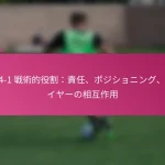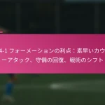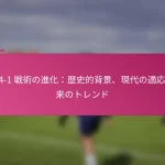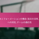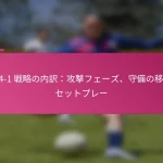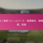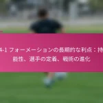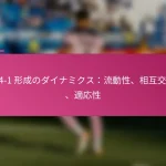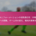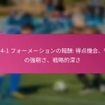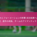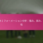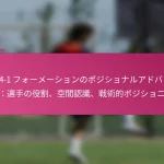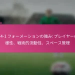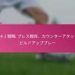 3-2-4-1フォーメーションは、サッカーにおける多用途な戦術的セットアップであり、防御力と攻撃力のバランスを取ります。フォーメーションの変更、選手交代、試合中の戦術など、効果的な戦術調整は、試合の進行するダイナミクスに適応し、チームのパフォーマンスを最適化するために重要です。 3-2-4-1フォーメーションとは何か、その主な特徴は? 3-2-4-1フォーメーションは、強固な防御基盤を強調しつつ、攻撃に柔軟性を提供するサッカーの戦術的セットアップです。このフォーメーションは、3人のセンターバック、2人のセンターミッドフィルダー、4人の攻撃選手、1人のストライカーで構成されており、防御の堅実さと攻撃の創造性の両方を可能にします。 3-2-4-1フォーメーションの定義と構造 3-2-4-1フォーメーションは、3人のセンターバックが堅固な防御ラインを形成するように構成されています。その前には、2人の守備的ミッドフィルダーがサポートを提供し、通常はウイングと攻撃的ミッドフィルダーからなる4人の攻撃選手が得点機会を創出します。孤立したストライカーは前方でプレーし、ミッドフィルダーからのサポートに依存します。 このフォーメーションは、チームが防御的にコンパクトな形を維持しつつ、攻撃に幅と深さを提供することを可能にします。選手のポジショニングは重要であり、これにより防御から攻撃への迅速な移行が可能となり、チーム全体の効果を最大化します。 3-2-4-1フォーメーションの強み 防御の安定性:3人のセンターバックが強固な防御基盤を提供し、相手が侵入するのを困難にします。 ミッドフィールドの支配:2人のセンターミッドフィルダーがミッドフィールドエリアを支配し、ボールの保持と配分を向上させます。 攻撃の多様性:4人の攻撃選手がポジションを入れ替え、ディフェンダーに混乱をもたらし、得点機会を生み出します。 柔軟性:このフォーメーションは、さまざまな試合状況に簡単に適応でき、迅速な戦術調整を可能にします。 3-2-4-1フォーメーションの弱点 カウンターアタックへの脆弱性:多くの選手が攻撃にコミットするため、チームは迅速なカウンターアタックにさらされる可能性があります。 ウイングプレイへの過度の依存:ウイングが無力化されると、チームは得点チャンスを生み出すのに苦労するかもしれません。 中央の選択肢が限られる:孤立したストライカーは、ミッドフィルダーが効果的にサポートしない場合、孤立してしまう可能性があります。 高いフィットネスレベルが必要:選手は、このフォーメーションで必要な広範囲をカバーするために高いエネルギーレベルを維持しなければなりません。 選手のポジショニングの視覚的表現 ポジション 選手の役割 CB センターバック CB センターバック CB センターバック CM センターミッドフィルダー CM センターミッドフィルダー RW…